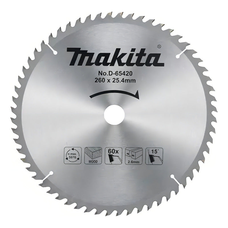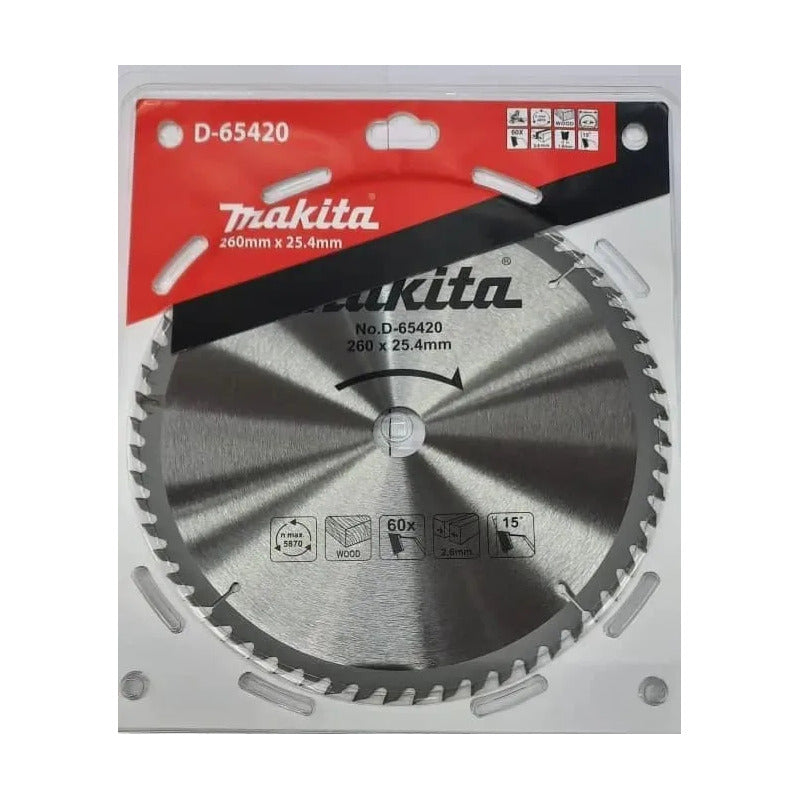 La hoja de sierra TCT Economy D-65420 de Makita es adecuada para usuarios finales de alto volumen como trabajadores formales. Tiene una excelente velocidad de corte y la velocidad máxima es de 5870 rpm. La hoja viene con un corte de 2,6 mm y un rastrillo de 15°. Estas hojas de sierra de inglete son adecuadas para usuarios casuales. Mide 260 mm de diámetro por 25,4 mm de diámetro. Viene con 60 dientes.